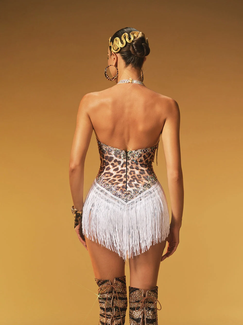 Body Azhor dos nu à franges et strass léopard